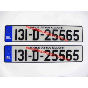 Plates are made  with  IRL Flags, Hyphens (-) and the County Name as Standard.